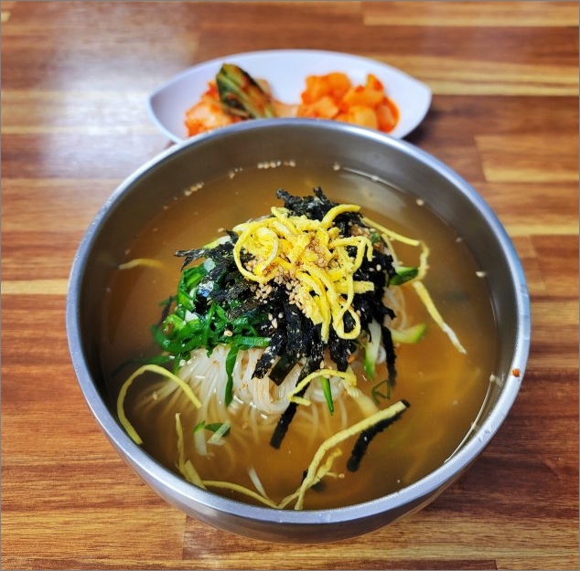 - 특징: 메밀, 고구마 전분 등을 혼합해 만든 국수로, 차갑게 먹는 국수입니다. 주로 여름철에 시원하게 즐기며, 고소하고 담백한 맛이 특징입니다.