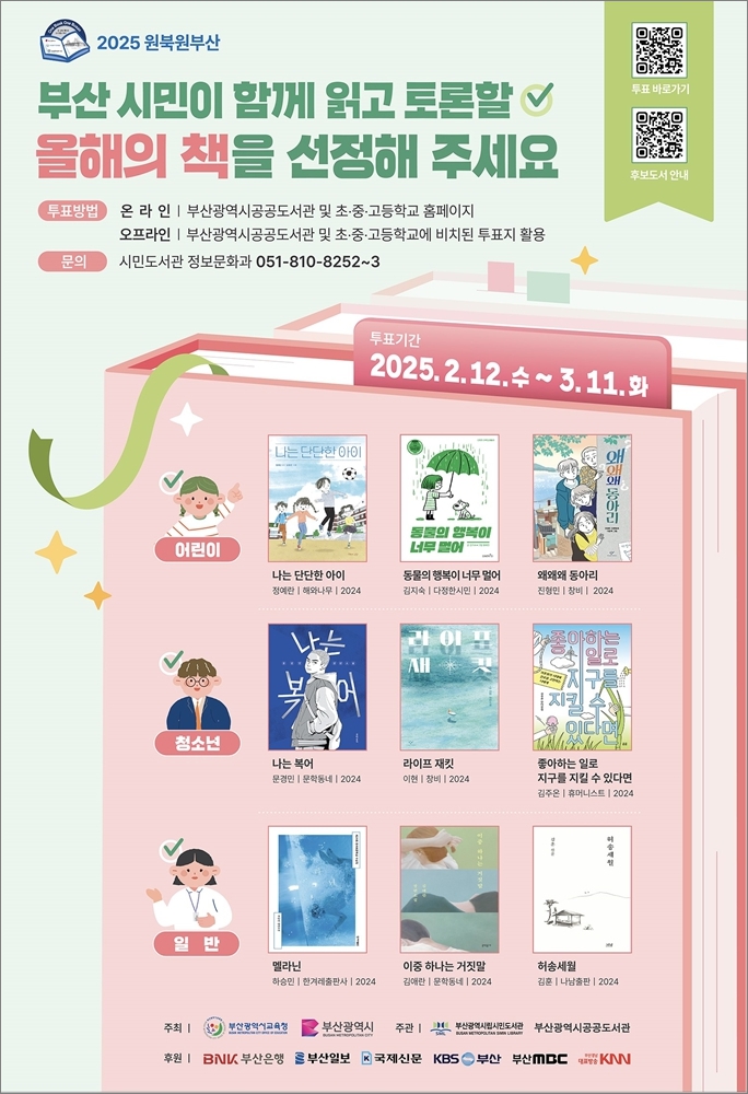 부산시민도서관은 2025년 '원북원부산' 운동의 일환으로, 부산 시민이 함께 읽고 토론할 '올해의 책' 선정을 위한 시민 투표를 진행하고 있습니다. 투표 기간은 2025년 2월 12일 오전 9시부터 3월 11일 오후 6시까지로, 어린이, 청소년, 일반 부문에서 각각 3권씩 총 9권의 후보 도서가 선정되어 있습니다.