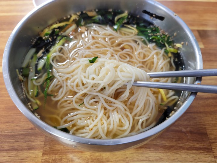 두 번째는 국물과 함께 국수면을 먹었다. 최고의 쫄깃함은 아니다. 하지만 충분히 괜찮았다. 이 정도면 A급이다. 그날 배가 고팠는지 몰라도 양이 살짝 작다는 느낌이 들었다. 그날 오전에 나가 3시간 정도를 걸었으니 꽤나 허기가 졌던 것이다. 국수는 원래 간식으로 먹는 음식이지 정식 밥이 아니다.